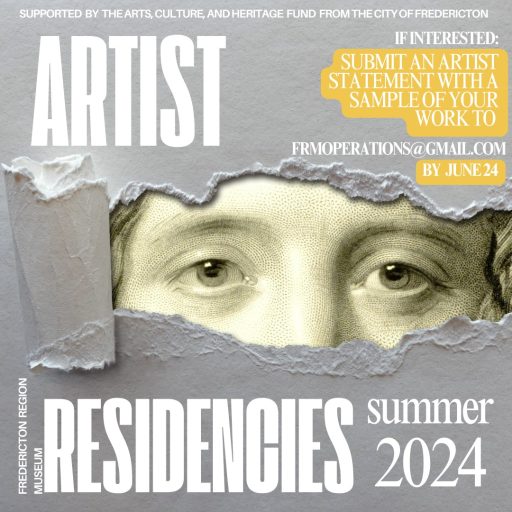 The Fredericton Region Museum is pleased to announce that we are once again putting on our Artist-in-Residence Program! Successful candidates will receive a $500 honorarium with an additional $100 in art supplies for a 2 week residency. If interested, please send your artist statement and your portfolio to frmoperations@gmail.com by June 24. We hope to hear from you soon!