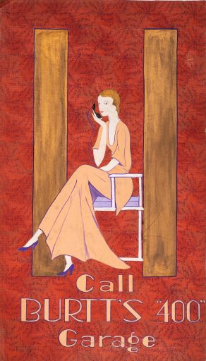 Downtown Fredericton, Mary Grannan’s twelve art deco posters are now preserved in the Fredericton Region Museum, along with her oil portraits and handmade toys – thanks to the gracious donation of Owen Fowler. These advertisements are all the more remarkable since they bear witness to commercial establishments, many of which have since disappeared from Fredericton’s downtown streetscape.